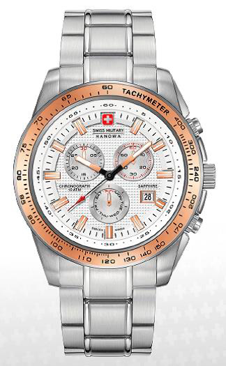 | 7. Swiss Military Hanowa Crusader Chrono 6-5225.04.001.09: корпус из нержавеющей стали 316L, безель с ионным покрытием розовой позолотой и тахиметрической шкалой, белый циферблат с часовыми индексами цвета розового золота, браслет из нержавеющей стали. | |