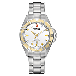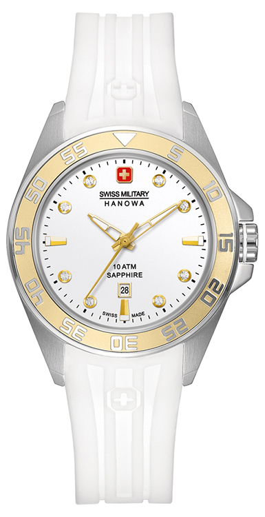 - Swiss Military Hanowa Sword Lady 6-6221-04.001.02: серебристый корпус, золотистый безель, серебристый циферблат с восемью камнями циркония, белый ремешок.