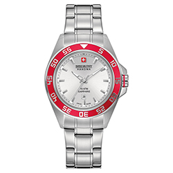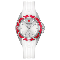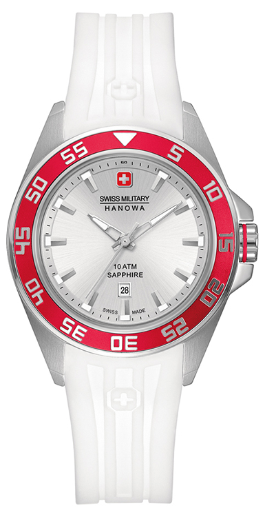 - Swiss Military Hanowa Sword Lady 6-6221-04.001.04: серебристый корпус, красный безель, серебристый циферблат, белый ремешок.