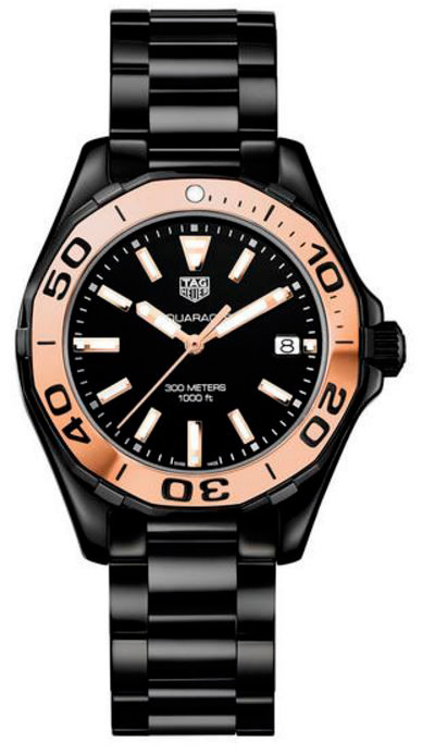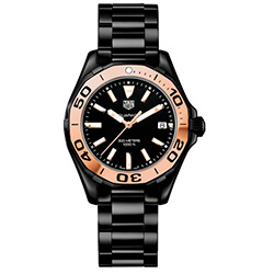 3. Tag Heuer Aquaracer Lady 300M WAY1355.BH0716 2016 HD Корпус из полированной чёрной керамики. Стальной полированный безель с розово-золотым 18-каратным PVD-покрытием. Чёрный циферблат с центральными стрелками и условными индексами с PVD-покрытием розовым золотом 18-карат. 3-х рядный керамический чёрный полированный браслет с застёжкой-бабочкой на предохранительных кнопках. |