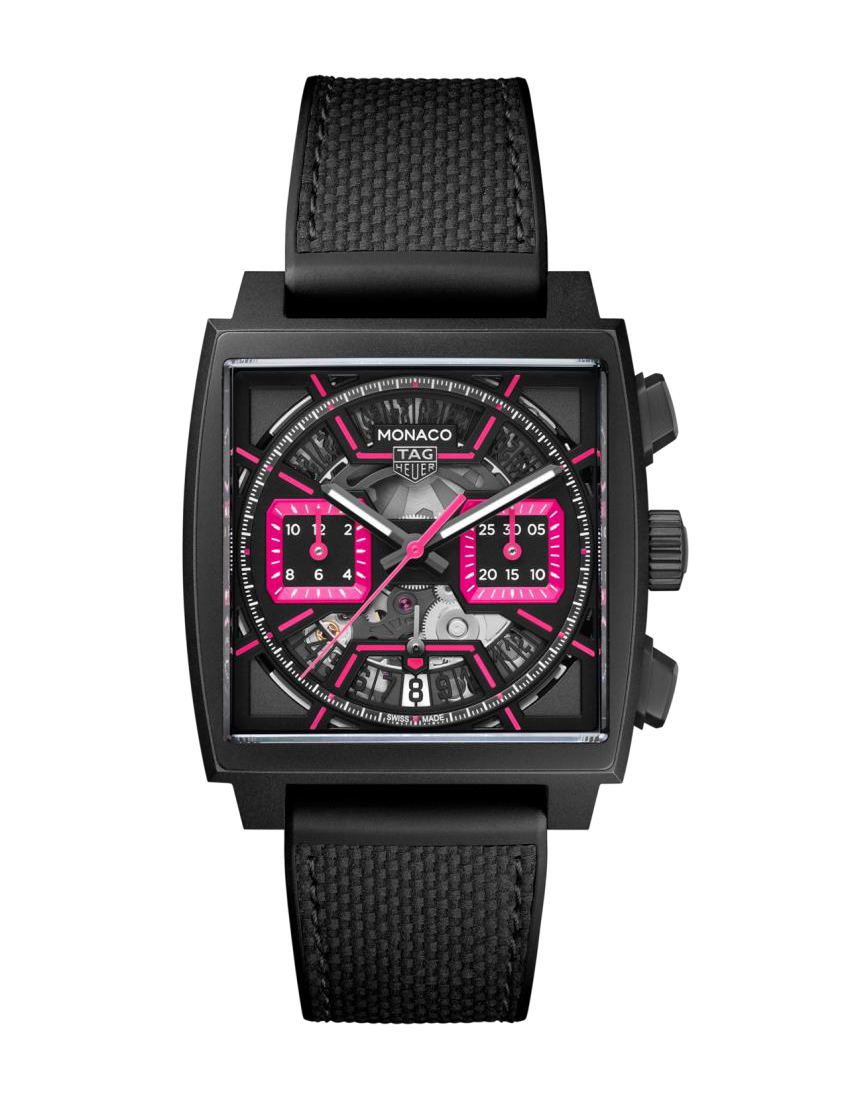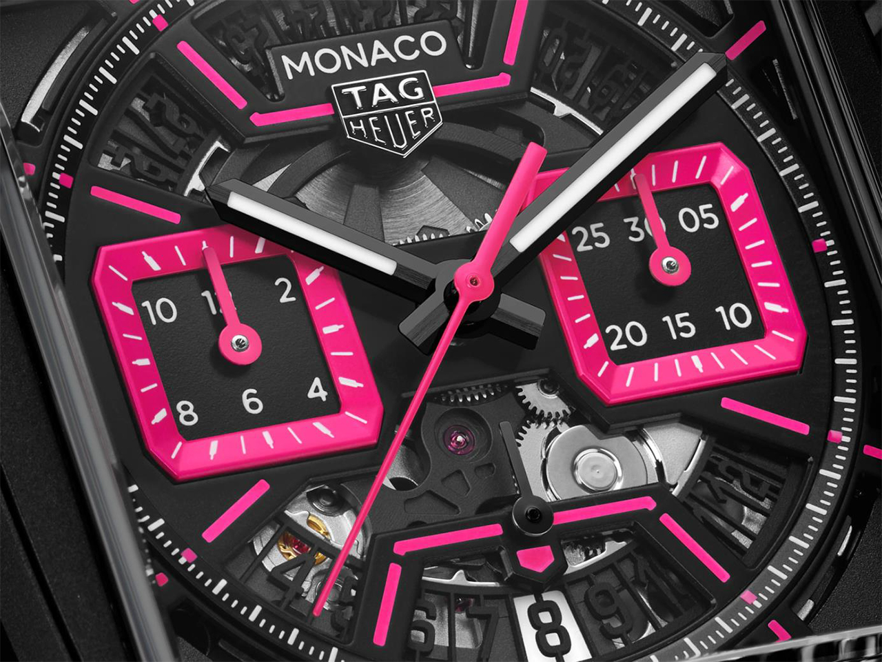Monaco Chronograph выделяется своим эффектным дизайном. Скелетонизированный циферблат в ярком розовом оттенке, дополненный контрастными акцентами, отражает калейдоскоп цветов Лас-Вегаса. Четкие индексы и стрелки с люминесцентным покрытием обеспечивают отличную читаемость, а хронограф подчеркивает функциональность модели. Корпус из нержавеющей стали с культовой квадратной формой, характерной для линейки Monaco, дополнен сапфировым стеклом и водонепроницаемостью до 100 метров, что делает часы надежным спутником в любой ситуации.