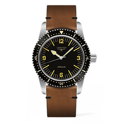 The Longines Skin Diver Watch выполнены в сдержанном стиле, характерном для дайверских часов. Корпус диаметром 42 мм с черным PVD-покрытием оснащен однонаправленно вращающимся безелем с метками. Треугольная отметка в положении «12 часов» светится в темноте и помогает определить оставшееся время погружения. Циферблат с узором «ячменное зерно», покрытый сапфировым стеклом купольной формы, украшен индексами и арабскими цифрами. Покрытие Super LumiNova® на цифрах, индексах и стрелках обеспечивает оптимальную читаемость циферблата. Задняя крышка украшена изображением водолаза – по аналогии с оригинальной моделью. Крепление часов представлено в трех вариантах. Можно выбрать между черным каучуковым ремешком, имитирующим ткань, браслетом миланского плетения или кожаным ремешком, чтобы дополнить образ этих уникальных часов.