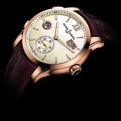 | 1. Модель Dual Time Manufacture 3346-126/90: корпус из 18-каратного розового золота, циферблат «Eggshell», ремешок из кожи аллигатора коричневого цвета. | |