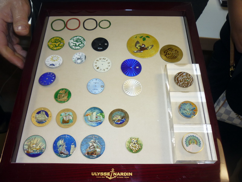 Понаблюдав за процессом, мы попали на фабрику Donzé Cadrans – здесь и только здесь создаются знаменитые эмалевые циферблаты. И не только для Ulysse Nardin, среди заказчиков, к примеру, Breguet, Patek Philippe. До недавнего времени фабрика была независимой, но в прошлом году Donzé Cadrans стала частью Ulysse Nardin. Техника нанесения перегородчатой эмали сродни ювелирному искусству. Канва рисунка наносится на циферблат тонкой золотой нитью. Затем внутрь вбивается порошок – в каждом сегменте сюжета он своего оттенка. При этом мастеру  важно в каждый паз вложить порошка ровно столько, чтобы его не оказалась ни много - ни мало. Такую работу выполняет единственная женщина – она занимается этим делом уже больше 40 лет и, конечно, достигла совершенства.