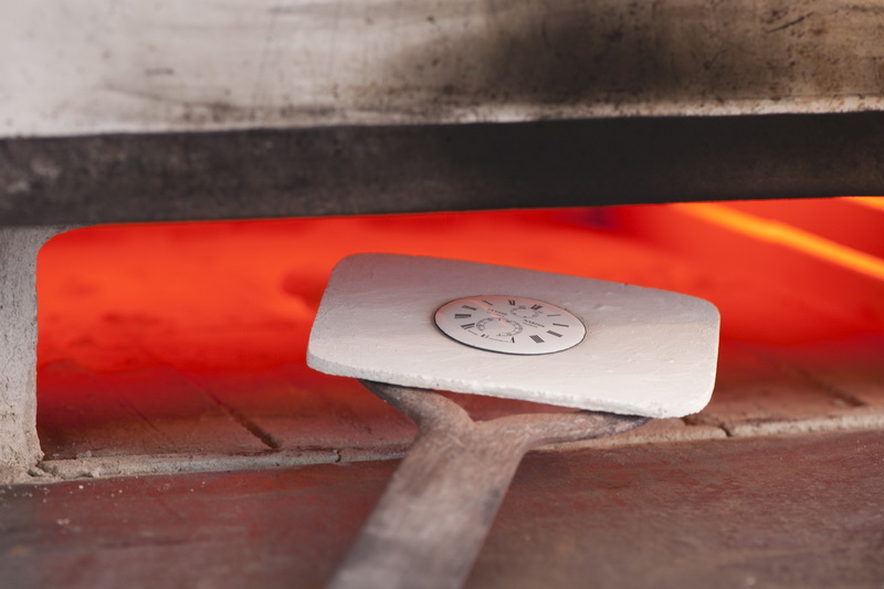 Процесс производства циферблатов с эмалевым покрытием до сих пор происходит вручную. Технология за более чем сто лет не изменилась. Каждый изготовленный циферблат – исключительное изделие штучной работы. Мы видели, как происходит процесс изготовления циферблатов  Maxi Marine Chronometer. Заготовку будущего циферблата покрывают белым порошком, запекают и снова наносят слой порошка – пятикратный обжиг дает ровный белый цвет. Сколько по времени циферблату запекаться, мастер определяет на глаз, по интуиции - он также отвечает за данный процесс в Ulysse Nardin уже больше сорока лет. Затем с помощью мягкого трафарета наносят разметку на циферблат.