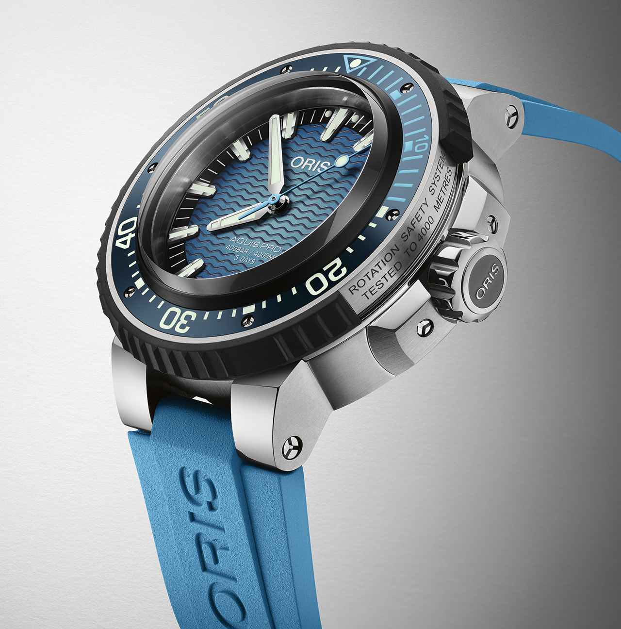 Oris создали AquisPro 4000m, самые водонепроницаемые часы для дайверов из когда-либо созданных, с титановым корпусом, способным выдерживать давление до 400 бар (что эквивалентно 4000 бар).метров глубины. Модель оснащена запатентованной технологией Oris, включая систему безопасности вращения. В часах предусмотрена система удлинения складной застежки безопасности, это означает, что ремень можно легко регулировать по длине пока часы носят.